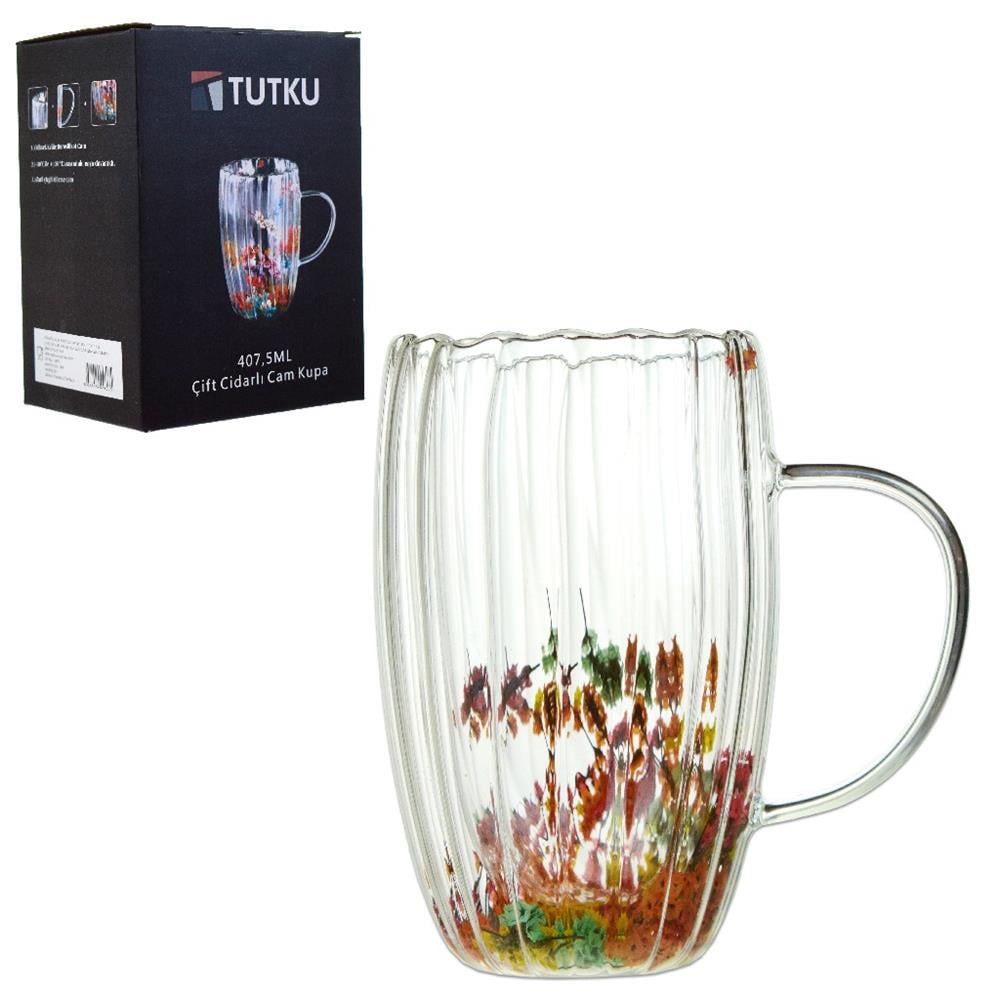 Çift cidarlı cam kupa 407 ml, yüksek sıcaklıklara dayanıklı borosilikat camdan üretilmiştir. Hafif ve ergonomik tasarımı ile elde rahatça tutulur ve şeffaf yapısı içeceğinizi görsel olarak daha çekici hale getirir.